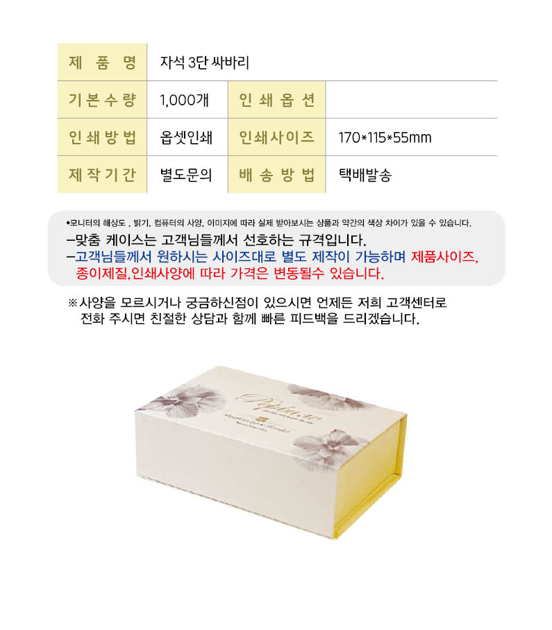| 기타사항 | •기본수량 1,000개 •Size : 170x115x55 mm |